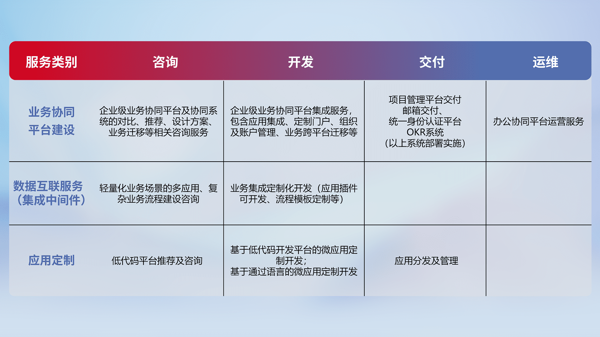 针对钉钉、、、企微、、IDaas等平台级产品提供产品的规划、、方案、、、、交付、、定制化开发等服务,,,实现如统一协同办公、、、、智能客户服务、、、混合会议管理、、智能数据查询、、、、等业务场景,,,实现数字化转型。。。